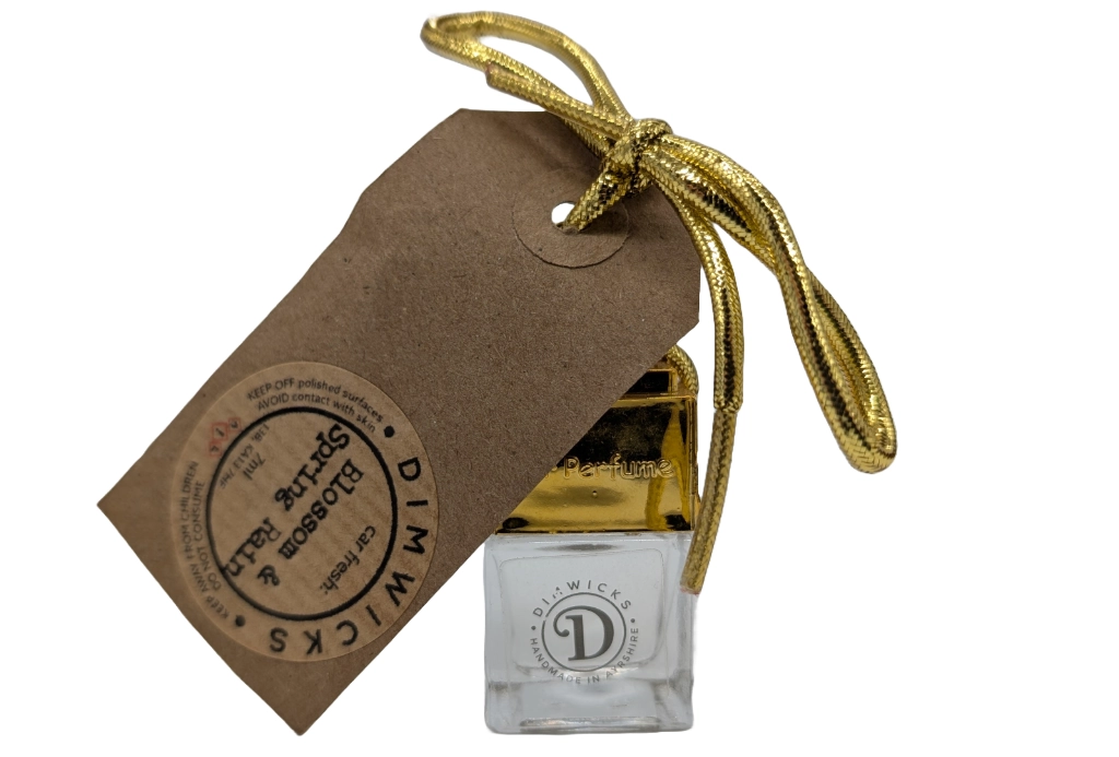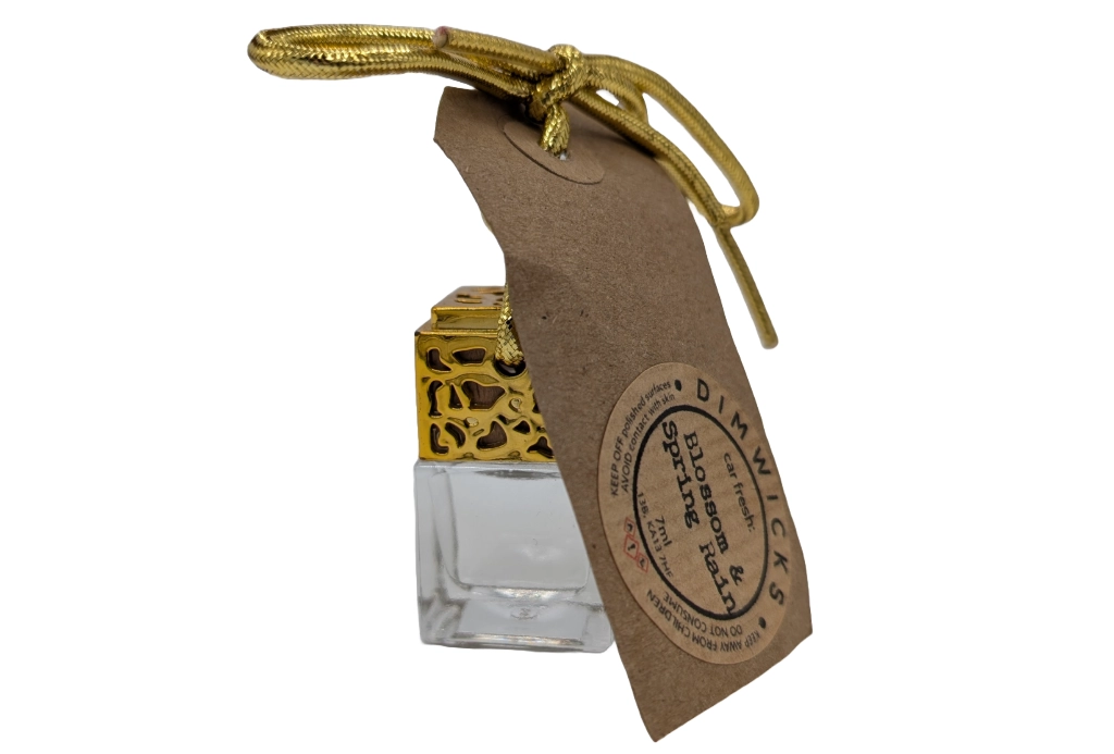 Blossoms and Spring Rain Car Air Freshener. Aroma Oil Car Air Fresheners from Dimwicks are the perfect addition to any vehicle. This eco-friendly product comes filled and ready go, with refills available meaning there is very little future waste! Clip the Air Freshener to your air vent or hang up in your vehicle. Over 6 months of scent life available so no more frequent replacing required as is the case with many Car Freshener products.