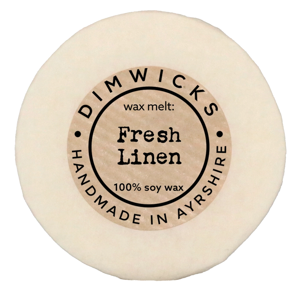 Fresh Linen Wax Melt. The Wax Melt is Dimwicks’ Signature product! Made from 100% soy wax and completely eco-friendly Dimwicks have turned this product in to a must have fan favourite. Long scented burn you won’t need to replace your wax melt often. The aroma will still continue to emanate while cold so you can enjoy the subtle scent filling your rooms between burns or long after your tea-light has burnt out. Every single wax melt is hand made and hand wrapped to ensure the perfect finish.